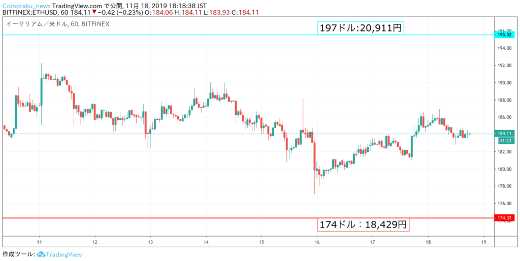 18日18時現在のイーサリアムの価格は184.06ドル(20,051円)、前日同時刻比で+0.14%のわずかな上昇となっている。