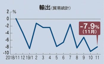 11月の輸出額7.9%減、12カ月連続の減少 - 日本経済新聞