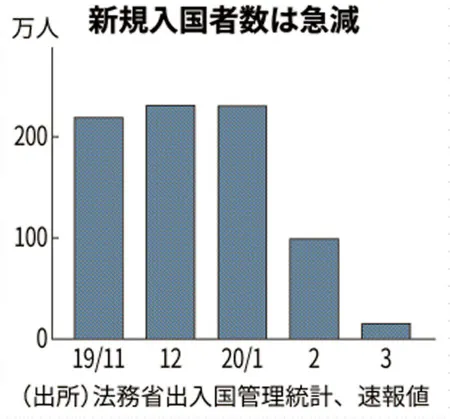 2月の外国人新規入国者数は98万9千人と前年同月の236万9千人の半分以下だった。中国人の入国者数も6万人を下回り、前年同月の56万7千人から10分の1程度になった。