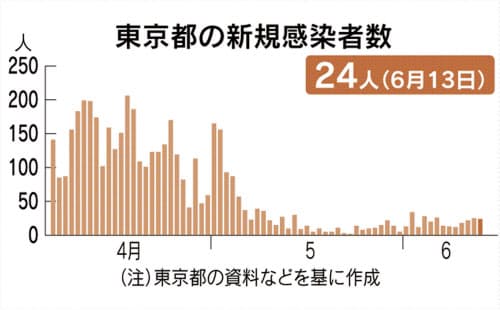 東京都で13日、新型コロナウイルスの感染者が新たに24人確認されたことが関係者への取材で分かった。1日あたりの感染者が20人以上となったのは3日連続。都内の感染者は計5497人になった。