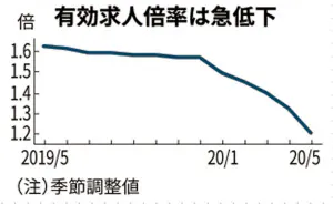 厚生労働省が30日発表した5月の有効求人倍率(季節調整値)は1.20倍と、前月から0.12ポイント低下した。下げ幅は1974年1月以来、46年4カ月ぶりの大きさとなった。新型コロナウイルスの感染拡大で雇用環境が急速に悪化している。