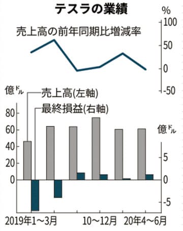 【シリコンバレー=白石武志】米テスラが株式市場に強さを再認識させた。新型コロナウイルスの打撃を受けたにもかかわらず、22日発表した2020年4~6月期決算は最終損益が1億400万ドル(約110億円)の黒字を保った。4~6月期に巨額の赤字を見込むライバルに差を付けたのが、世界最大の電気自動車(EV)市場となった中国販売の伸びだ。