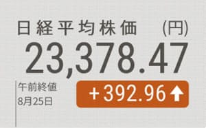 一時400円近く値を上げ、2万3300円台後半で推移する日経平均株価(25日午前、東京都中央区)