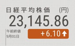 1日午前の東京株式市場で日経平均株価は小幅に続伸し、前日比6円10銭(0.03%)高の2万3145円86銭で前場を終えた。菅義偉官房長官が2日に自民党総裁選への立候補を表明すると伝わり、安倍晋三首相の辞任後も政策が継続するとの期待感から買いが優勢になった。