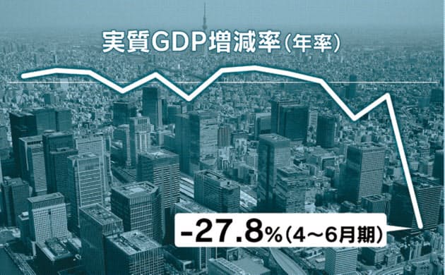 日本の実質国内総生産(GDP)は1~3月期から年率換算で27.8%減った。米国の減少率は32.9%、英国は…