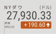 【NQNニューヨーク=川内資子】21日の米株式相場は続伸し、ダウ工業株30種平均は前日比190ドル60セント(0.7%)高の2万7930ドル33セントで終えた。スマートフォンのアップルが5%を超える大幅高となり、相場上昇をけん引した。米経済指標の改善で景気への過度な懸念が薄れ、景気敏感株が買い直されたのも相場を支えた。